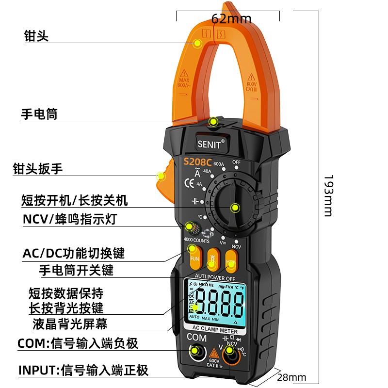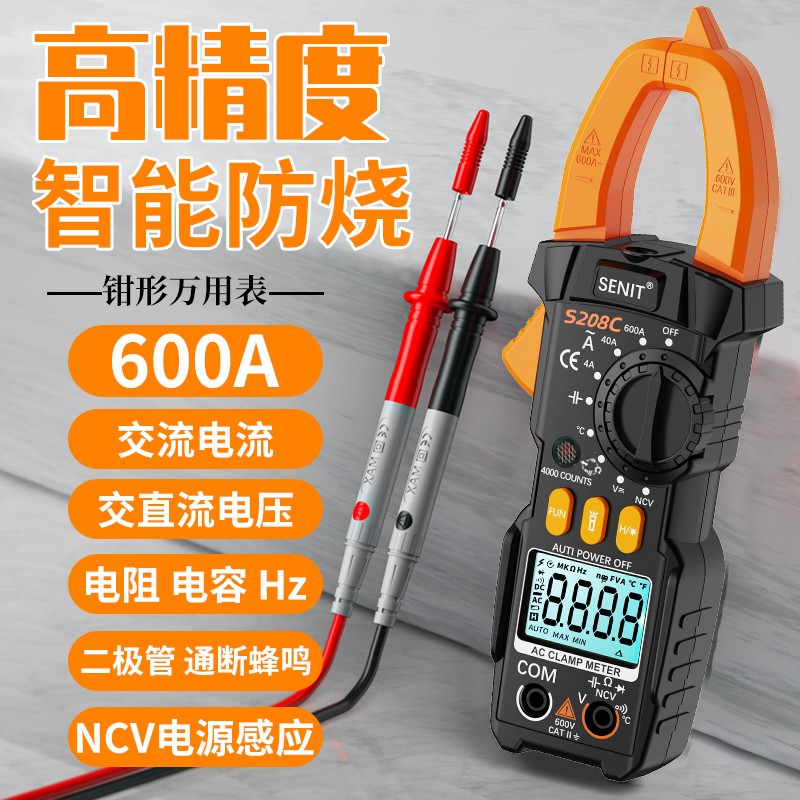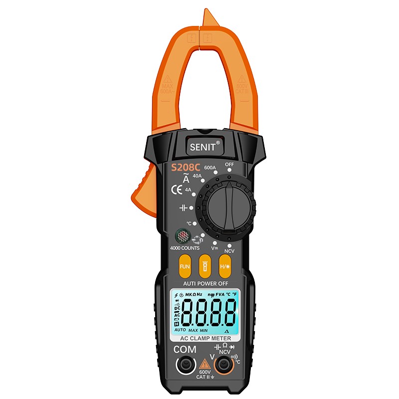 SENIT 208C 是一款专为电工设计的高精度多功能钳形表,集电流、电压、电阻、电容及频率测量功能于一体。