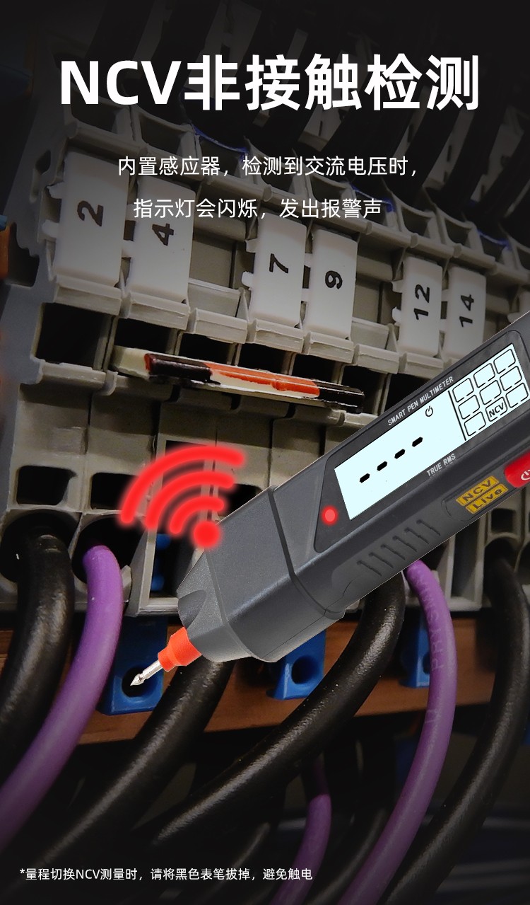 非接触电压检测 (NCV):无需直接接触导线,通过感应快速识别高压电场,避免触电风险。适用于墙内线路、插座和配电箱的安全扫描。