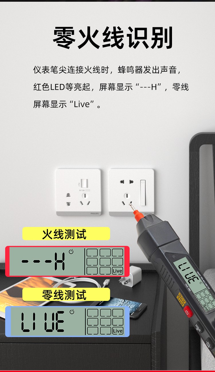 LED 日光灯专属检测:独特“日光灯”模式,专为 LED 灯具设计,能精准识别“零火线”混淆问题,避免安装错误。