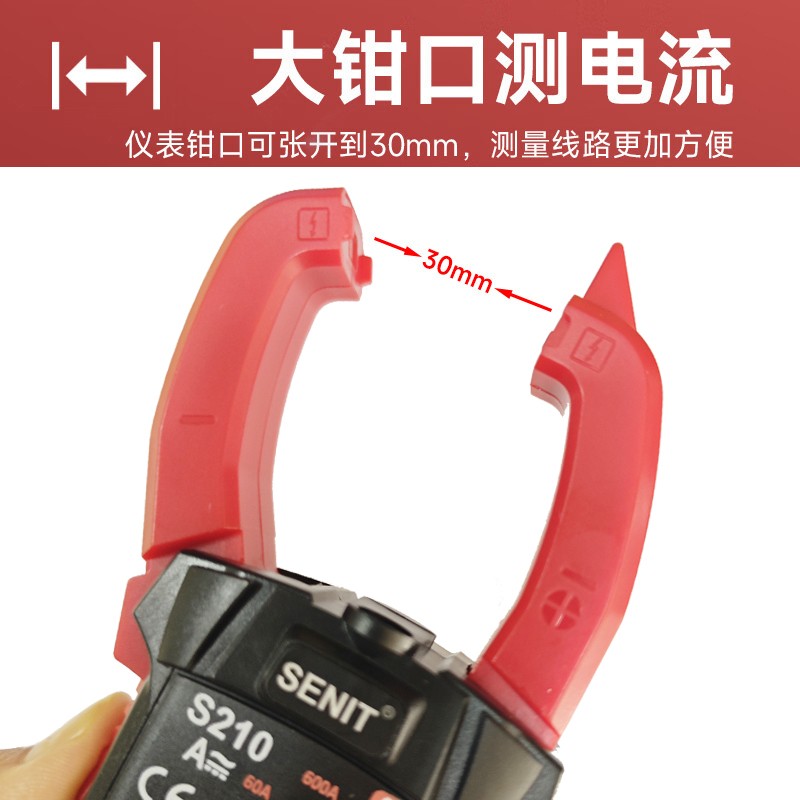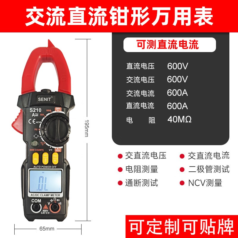 The SENIT S210 is a high-precision digital clamp multimeter designed for electrical repairs, industrial inspections, and home appliance maintenance. Featuring a 6000 counts high-resolution LCD display, it supports auto-ranging and auto power-off for accurate measurements and easy operation. This tool enables non-contact clamping for AC/DC currents up to 600A and voltage measurements up to 600V, while also handling resistance, capacitance, frequency, diode testing, continuity checks, and non-contact voltage detection (NCV). With its anti-burn and anti-drop construction, it's built tough for high-voltage use (CAT III 600V), serving as a reliable all-in-one solution for electricians. Compact and lightweight (approx. 18x8x5cm, 0.35kg), it's user-friendly, versatile, and offers excellent value.
